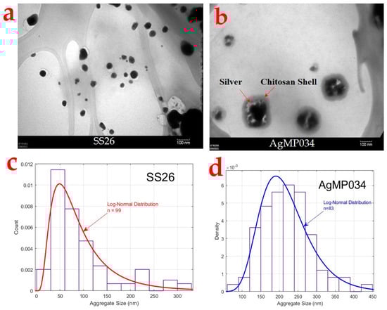 TEM images of (a) SS26 and (b) AgMP034; log-normal distributions of (c) SS26 (n = 99) and (d) AgMP034 (n = 83).