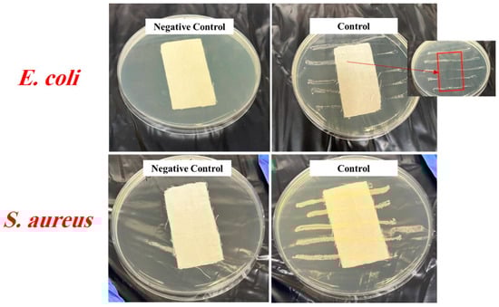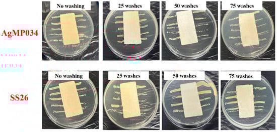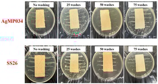 To study the effect of the crosslinking agent on the washing durability, the antibacterial activities of AgMP034 and SS26 were also qualitatively tested against the same bacterial strains used for previous samples, and the results are shown in Figure 9 for E. coli and Figure 10 for S. aureus. Based on Figure 9 and Figure 10, all the coated samples showed remarkable antibacterial efficacy, even after 75 wash cycles, which can be attributed to the sufficient Ag coverage on the samples. Therefore, highly durable coated fabrics can be obtained by using a crosslinking agent. The crosslinking agent helped to form a stable and durable coating on the cotton fabrics. It improved the adherence of the microparticles to the cotton fibers, resulting in sufficient antibacterial properties, even after several washing cycles.