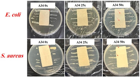 AATCC 147—A34 sample with no washing and 25 and 50 wash cycles against E. coli and S. aureus. Red arrows show the growth of bacteria.