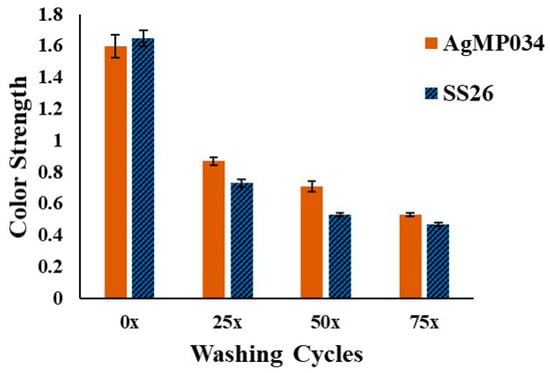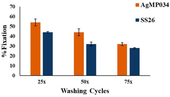 Figure 11 illustrates the color strength (K/S) plots of SS26 and AgMP034 before and after washing. Based on Figure 11, the color strength decreased after washing for both samples, indicating a reduced silver amount on the fabrics. To elucidate the significance of the bond formation between microparticles and cotton fabric as a substrate, the %Fixation was compared for AgMP034 and SS26 following multiple wash cycles. According to Figure 12, SS26 exhibited %Fixation values of 44%, 32%, and 28% following 25, 50, and 75 washing cycles, respectively. For AgMP034, the %Fixation values were higher at 54%, 44%, and 32% for the same sequence of washing cycles. The presence of chitosan surrounding the silver particles might have been the reason for the higher %Fixation values for AgMP034.