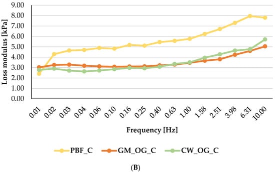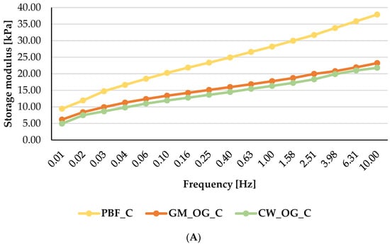 Storage modulus G′ (A) and loss modulus G″ (B) curves for meat compositions during the frequency test. PBF_C—meat composition with pork backfat; GM_OG_C—meat composition with glycerol monostearate oleogel; CW_OG_C—meat composition with candelilla wax oleogel.
