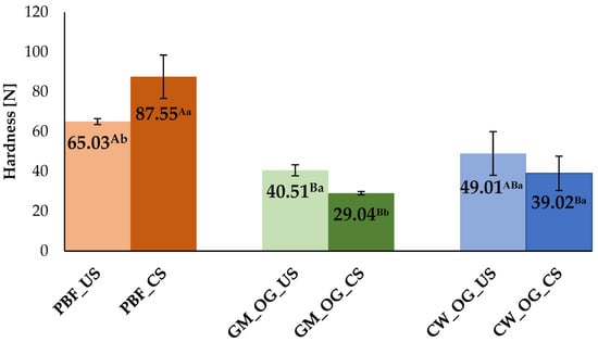Hardness for uncooked and cooked Bologna sausages. Values are expressed as mean ± standard deviation. PBF_US—uncooked sausages with pork backfat; GM_OG_US—uncooked sausages with glycerol monostearate oleogel; CW_OG_US—uncooked sausages with candelilla wax oleogel; PBF_CS—cooked sausages with pork backfat; GM_OG_CS—cooked sausages with glycerol monostearate oleo-gel; CW_OG_CS—cooked sausages with candelilla wax oleogel. For each characteristic, identically superscript capital letters indicate no significant differences (p > 0.05) between samples (PBF_US vs. GM_OG_US vs. CW_OG_US; PBF_CS vs. _GM_OG_CS vs. CW_OG_CS). Identically superscript lowercase letters indicate no significant differences (p >0.05) between uncooked and cooked samples (PBF_US vs. PBF_CS; GM_OG_US vs. GM_OG_CS; CW_OG_US vs. CW_OG_CS).