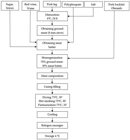 Bologna sausages were manufactured according to the process flow diagram (Figure 3) and the ingredients of the formulations are presented in Table 4. Boneless and fatless pork leg was thawed at 18–20 °C for 24 h before being cut into pieces and combined with a 2% salt solution and matured for 24 h at 4 °C. The final composition consists of 70% ground meat and 30% meat batter. In order to obtain ground meat from the salted and matured meat, a meat grinder with an 8 mm sieve was used (Bizerba SE & Co. KG, Balingen, Germany). To prepare the meat batter, ground meat, spices, polyphosphate, water, and wine were added to the bowl cutter (Meprotec GmbH, Pasching, Austria) and finely chopped until a paste with adhesive properties, and homogenous structure was obtained. The oleogels or pork backfat (30%) were added after the meat batter was obtained, during the homogenization operation. After the homogenization process, samples were collected from each sausage composition in order to be analyzed before the applied heat treatment. The composition was stuffed in natural casings (pork intestines with 20 mm diameter) which were then tied (200 mm length) and if air bubbles were observed under the casing, the respective portions were punctured. The sausages were placed on a meat rack and subjected to a series of thermal treatments in a smoking and scalding chamber (H. Maurer & Söhne Rauch- und Wärmetechnik GmbH & Co. KG, Reichenau, Germany): air drying at 75 °C for 30 min, hot smoking at 75 °C for 30 min and pasteurization in a water bath at 75 °C for 20 min. The products were cooled, vacuumed in special bags, and stored between at 2–4 °C. The tests carried out on the meat compositions were performed on the same day of manufacture, and finished products analysis 24 h after production. The manufacturing recipe was taken from (Erwin and Hermann, 1987).