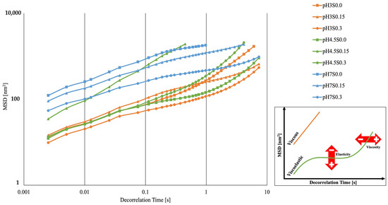 By analyzing the solid–liquid balance index (SLB) and elasticity index (EI) values (Table 3), it was noticed that both pH and ionic strength significantly affect the microrheological properties of the obtained hydrogels. NaCl had a more substantial effect on the variance of SLB (η2 = 0.838) while pH had a stronger effect on the variance of EI (η2 = 0.959). Nonetheless, both parameters affected the elasticity index of the obtained hydrogels. The decrease in the pH value from 7 to 4.5 shifted the properties of the hydrogel (induced without the addition of NaCl) to more solid-like (SLB < 0.5). However, a further decrease in the pH value to 3 caused the hydrogel to exhibit more viscous (liquid-like) properties (SLB > 0.5). Furthermore, the addition of salt changed this trend, causing the SLB index of hydrogels at pH 4.5 to reach higher values, with the hydrogel at pH 4.5 and the addition of 0.15 M NaCl reaching the highest value. NaCl (0.3 M) at pH 7 and 3 caused the hydrogels to exhibit highly solid-like properties. In the case of the EI, it was observed that only the hydrogel induced with the addition of salt exhibited higher elasticity when the pH value decreased [46,49]. Based on the analysis of the average trajectory of numerous particles in the obtained hydrogels, the Mean Square Displacement (MSD) was obtained as a function of decorrelation time (Figure 2). The analyzed samples had mostly viscoelastic properties, exhibiting the properties of soft gels (weak gels). The non-rectilinear MSD curve moving close to the baseline indicates that more particles were immobilized (caged) by the obtained gel network. The hydrogel induced at pH 3 and 0.3 M NaCl exhibited predominantly viscoelastic properties. On the contrary, the hydrogel induced at pH 7 and 4 (with 0.15 M NaCl) presented the least viscoelastic properties—their MSD curves leaned towards becoming more rectilinear, presenting more viscous characteristics.
