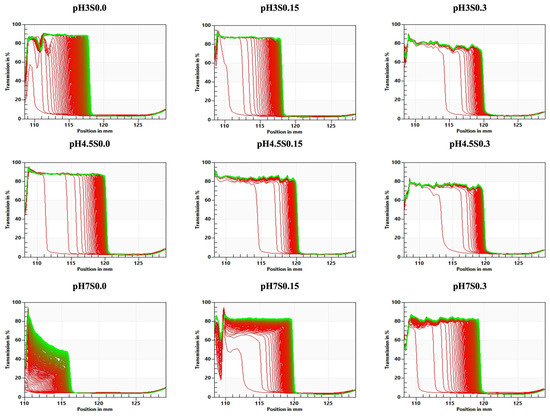The transmission profiles obtained through STEP technology (space-time resolved extinction profiles) serve as ‘fingerprints’, indicating variations in particle concentration within the analyzed samples (Figure 3). For each obtained hydrogel, the changes in transmission profiles offer crucial insights into the kinetics of particle concentration fluctuations caused by the centrifugal forces leading to phase separation. After subjecting the hydrogel samples to centrifugal force, structural compression was observed. This compression is depicted by a decrease in light transmission in the right corner of each graph. The destabilization front moved downward in the sample, meaning that the highest particle concentration was at the bottom of the sample. At the same time, a transparent water phase remained in the upper parts [50,51]. Based on the transmission profiles, it is possible to conclude that the slowest destabilization changes occurred in the hydrogel induced at pH 7 (without the addition of salt). The structural compression was more significant when the pH was decreased from 7 to 4.5 (for all the hydrogels). However, the quickest compression occurred in the hydrogel induced at pH 4.5 without NaCl. Moreover, the hydrogels obtained with the addition of 0.3 M NaCl (at each of the pH values) were less affected by the centrifugal force applied during the analysis than the other hydrogels.