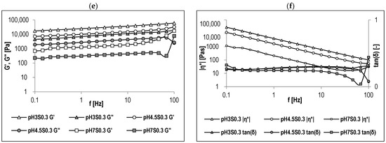Mechanical spectra of the obtained hydrogels are presented graphically as functional relationships G′, G″, |η*|, and tan(δ) = f(Hz). (a,b) without NaCl, (c,d) with 0.15 M NaCl, (e,f) with 0.3 M NaCl (n = 3). G′—storage (elastic) modulus; G″=—viscous (loss) modulus; |η*|—complex viscosity; tan(δ)—degree of viscoelasticity.