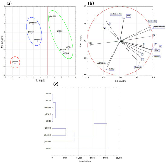 The obtained results were subjected to a principal component analysis (PCA) and a hierarchical cluster analysis (HCA). These two statistical methods were chosen to effectively summarize the data gathered in this study. The PCA was conducted with 12 active variables. Two principal components were identified (Figure 5a,b): Component 1 (F1) explained 55.54% of the variance, and Component 2 (F2) explained 23.20% of the variance. Combined, these two components account for a total of 78.74% of the variance in the results. Component 1 is strongly positively correlated with VGI (r = 0.90). On the other hand, a negative contribution of this factor was found for G’ (r = −0.95), G” (r = −0.96), |η*| (r = −0.95), and spreadability (r = −0.90). Component 2 is positively correlated with the instability index (r = 0.64) and negatively correlated with γ (r = –0.80) and adhesion (r = −0.70). Considering the above interdependencies, the first principal component can be interpreted as a measure of the conditions under which the hydrogel can form a gel structure with high elastic properties. In contrast, the second component can be interpreted as a measure of the conditions under which the hydrogel can form a structurally stable system. Based on the hydrogels’ distribution across the space of the principal components (Figure 5a) and the interaction distances shown in HCA (Figure 5c), it can be concluded that the first and the most prominent cluster on the right from the center (green cluster) represents the hydrogels with the highest volumetric gelling index values but low G’ and G” values (less elastic). These hydrogels were induced at pH 7, 4.5, and 3 (without NaCl addition) and pH 7 (with 0.15 and 0.3 M NaCl). Additionally, at pH 4.5 and 3 (the upper part of the green cluster), it was possible to obtain hydrogels with lower structural stability. The next cluster is the one in the upper left from the center (blue cluster), showcasing that the induction at pH 4.5 (0.15 and 0.3 M NaCl) and pH 3 (with 0.15 M NaCl) results in hydrogels with high G’ and G” moduli but low structural stability and VGI. However, only the sample induced at pH 3 and 0.3 M NaCl (pH3S0.3) showed the most significant difference from the other hydrogels (highest interaction distance, Figure 5c). The hydrogel exhibited the most elastic properties at pH 3 and 0.3 M NaCl and had high structural stability. Nonetheless, it still exhibited a low VGI value, which might have been caused by the high interactions between the biopolymers leading to the loss of a certain amount of water.