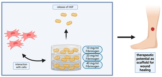 This study explores the relationship between fibrinogen concentration and the release dynamics of HGF from fibrin gels. By examining various fibrinogen densities, the research evaluates their impact on the kinetics of HGF release and the subsequent effects on primary cells and induced mesenchymal stem cells. These investigations are crucial for refining the design and enhancing the functionality of fibrin-based scaffolds, aiming to optimize their use in tissue engineering and personalized medicine. Additionally, by providing detailed insights into scaffold behavior and its interaction with different cell types, the study contributes to bridging the existing gap between basic research and practical clinical applications, facilitating the development of more effective therapeutic strategies. The study introduces a novel approach that goes beyond the current state of the art by employing a stack of three different fibrinogen concentrations with embedded HGF. Unlike previous methods that rely on single layers and result in a rapid burst release of growth factors, our multi-layered design enables a controlled and sustained release of HGF. This innovative strategy not only enhances scaffold stability but also ensures a prolonged therapeutic effect, creating an optimized healing environment that significantly improves tissue regeneration and overall wound healing outcomes.