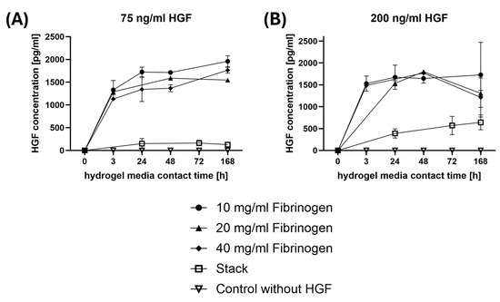 Figure 5 illustrates the release kinetics of HGF from fibrin gels of different fibrinogen concentrations and a stacked gel configuration over time, with two initial HGF concentrations: 75 ng/mL and 200 ng/mL. Figure 5A shows that the release of HGF from gels with an initial concentration of 75 ng/mL follows a trend where the amount of HGF detected in the medium generally increases over time. This trend is most pronounced in the 10 and 20 mg/mL fibrinogen gels, which demonstrate a more sustained release up to 168 h (7 days). The 40 mg/mL fibrinogen gel also exhibits a release pattern, but it levels off more quickly, indicating a possible early saturation or reduced release rate. The stacked gel shows a moderate and sustained release, but not as high as the lower concentrated gels. The stack approach exhibits a slower HGF release compared to a single layer, as the increased thickness of the gel results in more gradual degradation, thus facilitating a more controlled and steady release of HGF without a burst effect. The control without HGF, as expected, shows no release.
