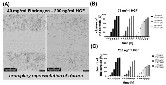 Figure 6B,C show the percentage of scratch closure in the presence of conditioned media from gels initially containing HGF concentrations of 75 ng/mL and 200 ng/mL, respectively. For the 75 ng/mL HGF condition shown in Figure 6B, there is a progressive increase in closure percentage, indicating that the HGF released into the media is stimulating cell migration. Interestingly, the conditioned media released from gels containing 10 and 20 mg/mL fibrinogen mediated better scratch closure than conditioned media released from gels containing 40 mg/mL fibrinogen, suggesting higher HGF release from less dense fibrinogen gels. Figure 6C illustrates the 200 ng/mL HGF condition, showing that higher HGF concentrations may initially induce a more robust migration; this effect, however, appears to diminish over time, particularly in higher fibrinogen concentrations. This could be due to a denser fibrin network at higher concentrations potentially restricting the release or diffusion of HGF into the media. It could be observed that cell migration appears more pronounced in the presence of 75 ng/mL HGF (Figure 6B) compared to 200 ng/mL HGF (Figure 6C). It can be hypothesized that this finding may be attributed to the optimal concentration of HGF required for maximal cell migration. Specifically, a concentration of 75 ng/mL HGF might create a more conducive environment for cell migration, whereas higher concentrations, such as 200 ng/mL, could potentially lead to saturation effects or trigger inhibitory mechanisms.