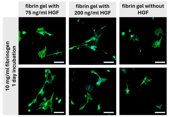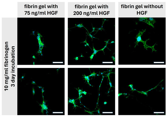 Cellular dynamics in fibrin gels after 3-day HGF exposure. The fluorescent images display the morphological progression of cells in 10 mg/mL fibrinogen hydrogels after a 3-day incubation period with two concentrations of HGF (75 ng/mL and 200 ng/mL) and without HGF. These images highlight the differences in cell network formation and interaction within the scaffold environment influenced by the presence and concentration of HGF. Scale bar 100 µm. (Staining: Phalloidin-488, green; DAPI: blue).