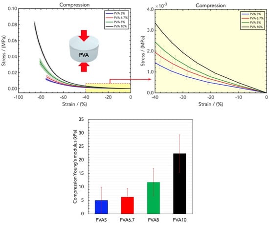 (Top) Stress/strain curves resulting from DMA (compression) analysis of wound dressings made of different concentrations of PVA in water, namely PVA5, PVA6.7, PVA8, and PVA10. (Bottom) Comparison of the compression Young’s moduli for the four PVA concentrations.