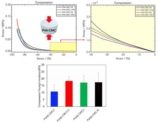 (Top) Stress/strain curves resulting from DMA (compression) analysis of wound dressings made of PVA8 in water and different concentrations of CMC, namely PVA8/CMC2, PVA8/CMC3.5, PVA8/CMC5, and PVA8/CMC10. (Bottom) Comparison of the compression Young’s moduli for the four CMC concentrations.