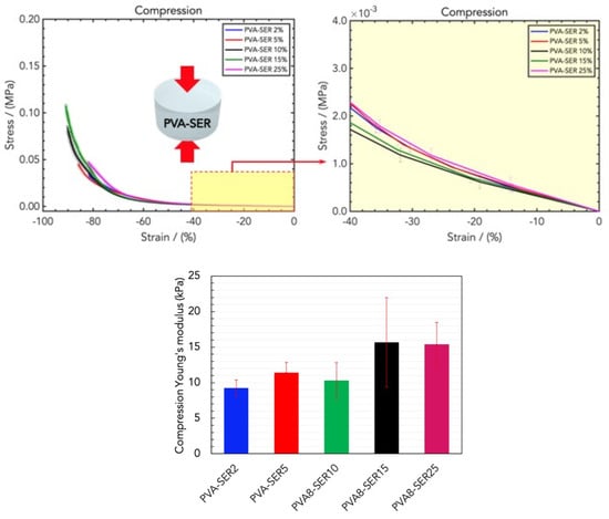 (Top) Stress/strain curves resulting from the DMA (compression) analysis of wound dressings made of PVA/water and different concentrations of sericin (SER), namely PVA8/SER2, PVA8/SER5, PVA8/SER10, PVA8/SER15, and PVA8/SER25. (Bottom) Comparison of the compression Young’s moduli for the five SER concentrations.