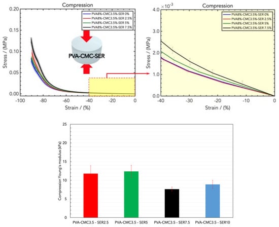 The combination of PVA with CMC and sericin provides optimal results in terms of the mechanical properties, as illustrated in (Figure 5). With fixed amounts of PVA and CMC (PVA8/CMC3.5), different SER loadings were tested, namely PVA8/CMC3.5/SER2.5, PVA8/CMC3.5/SER5, PVA8/CMC3.5/SER7.5, and PVA8/CMC3.5/SER10. The compression Young’s modulus values were as follows, respectively: (14.15 ± 2.13) kPa, (11.79 ± 1.61) kPa, (12.39 ± 0.55) kPa, (7.64 ± 1.09) kPa, and (8.90 ± 4.67) kPa (Figure 5, bottom). The effect of the addition of sericin to the PVA/CMC blend was a decrease in the linear elastic compressive rigidity, which is in contrast to the effect of sericin on PVA. This can be ascribed to sericin, with its lateral side groups in amino acids that facilitate blending with the polymeric chains of CMC, thus resulting in a softer and more elastic microstructure [,]. With a fixed amount of PVA (PVA8), the compression tests revealed the optimal loading of PVA8/CMC3.5 and that of sericin higher than in PVA8/CMC3.5/SER7.5. The compression results related to the hydrogel samples containing a higher concentration of sericin, namely PVA8/CMC3.5/SER15, were not reported since they were very slippery, which prevented a correct measurement.