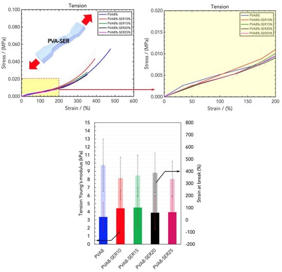 The sericin loading in PVA8/SER10, PVA8/SER15, PVA8/SER20, and PVA8/SER25 improved the low-strain rigidity but negatively affected the other parameters (Figure 7), allegedly due to the mechanical robustness and low elasticity of the protein, which hardened the texture and compactness of the hydrogels. In addition, higher sericin loadings induced a slippery effect on the gripping, which produced a lower Young’s modulus value.
