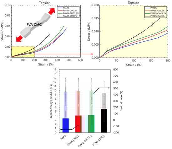 Fixing the amount of PVA8, CMC was added, and the linear elastic modulus was (10.81 ± 2.26) kPa, (18.42 ± 6.33) kPa, (17.38 ± 3.57) kPa, and (17.49 ± 10.37) kPa for PVA8/CMC2, PVA8/CMC3.5, PVA8/CMC5, and PVA8/CMC10 (Figure 3); therefore, the CMC loading increased the rigidity. The upper bound of this increase is represented by the rigidity of the PVA at the maximum tested concentration. In particular, the PVA8/CMC3.5 exhibited the best combination of linear elasticity and strain capability. With CMC loadings higher than that of PVA8/CMC3.5, the ultimate stress and strain exhibited by the prepared hydrogels decreased (Figure 3, bottom); therefore, we chose this combination.