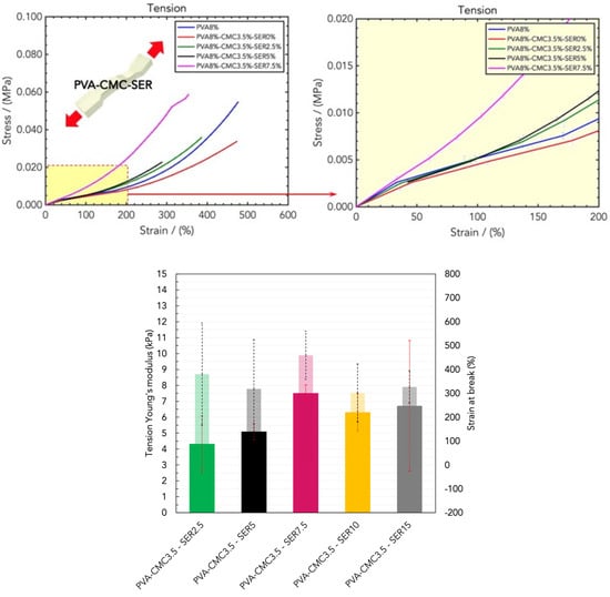 To evaluate the optimal sericin loading in tension mode, tensile tests were performed on hydrogel dressings made of the PVA8/CMC3.5 blend with different amounts of sericin. The results are reported in Figure 9 and reveal a steady increase in the tensile Young’s modulus with an optimal amount of sericin higher than in the PVA8/CMC3.5/SER7.5 blend, since these samples exhibited linear elastic rigidity, but maintained a high stretchability strain to break. In particular, the PVA8/CMC3.5/SER10 and PVA8/CMC3.5/SER15 blends had Young’s moduli of (6.32 ± 3.18) kPa and (6.71 ± 3.41) kPa, and strains to break of (301 ± 139)% and (326 ± 155)%, respectively.