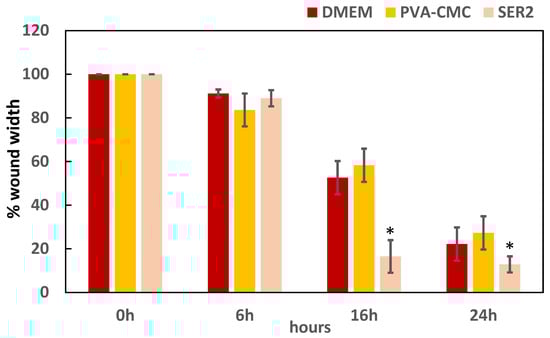 Quantification of the wounded area revealed that incubation with the SER2 dressing significantly enhanced the migration of HaCaT cells to the scratch area after 16 h (p = 0.001) and after 24 h (p = 0.0004), compared to the control (DMEM) and PVA8/CMC3.5 groups, whereas, no significant differences were found after 6 h when comparing the treated and CTRL groups (p = 0.24).