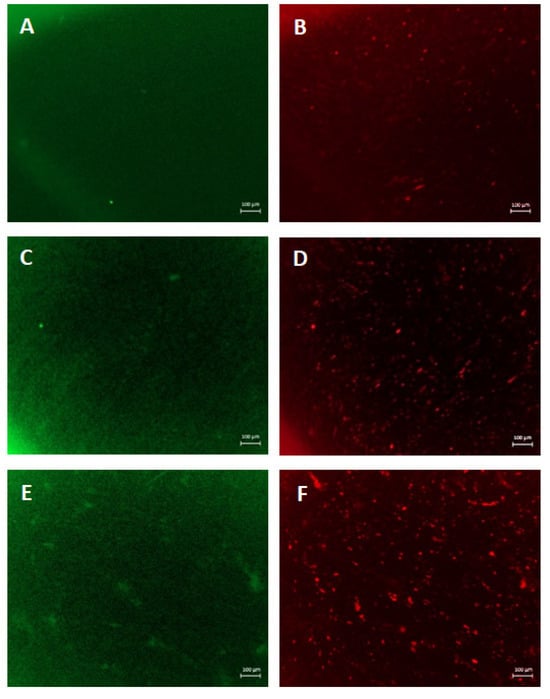 In situ staining of wounded EpiDermFT. Tissues were wounded with a 2 mm punch biopsy and immunostained with Keratin 14 (green fluorescence) (A,C,E) and vimentin (red fluorescence) (B,D,F). (A,B) Fluorescence micrographs of the control sample; (C,D) fluorescence micrographs tissues incubated with dressing containing only PVA and CMC; (E,F) wound incubated with SER2 dressing. Scale bars represent 100 μm.