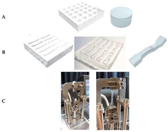 Samples used for the DMA analysis. (A) Circular samples for compression tests. (B) Dog-bone samples for tensile tests. (C) Real photos of the hydrogel dog-bone samples under tensile stretching.
