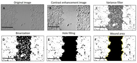 Overall process of wound image processing. (A) Original image; (B) scratch image after applying enhanced contrast; (C) image after applying the variance filter; (D) binarization of the image; (E) image after applying hole filling on the area of the wound; (F) selection of the scratch area.