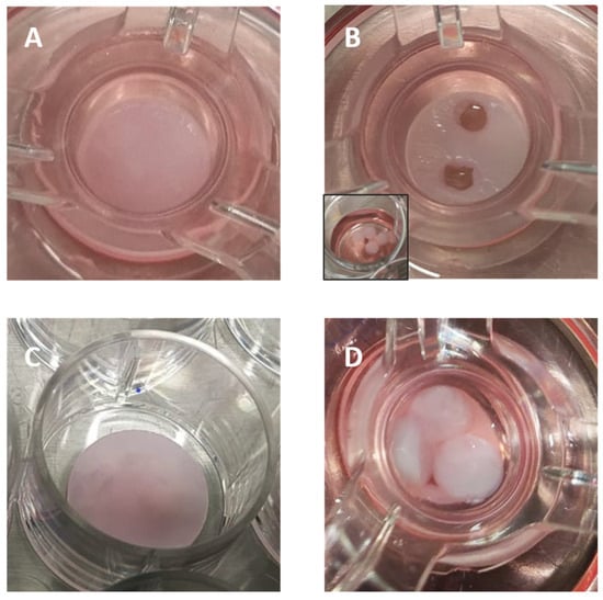 (A) EpiDermFTTM tissue following wounding; (B) cut EpiDermFTTM tissue; inset: sections of epidermis; (C) hydrogel wound healing dressing after immersion in DMEM medium; (D) cut EpiDermFTTM tissue incubated with wound dressings.