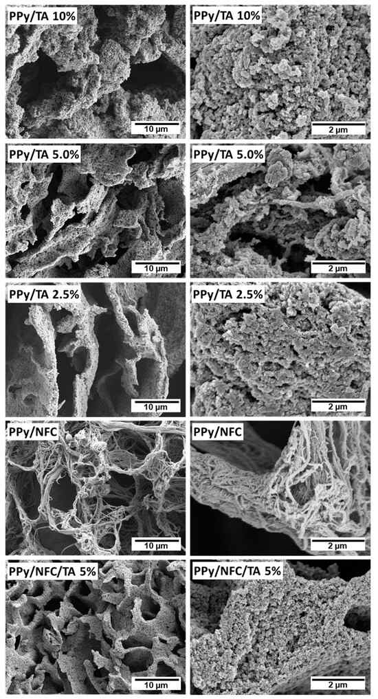 The surface morphologies examination reveals the formation of highly porous PPy/TA aerogels with different TA concentrations (Figure 1). The higher magnification shows that PPy/TA aerogel walls are composed of aggregates of spherical nanoparticles, which are much smaller than the particles of neat PPy, as shown in Figure 1 and Figure S1. In the case of PPy/NFC aerogel prepared in the absence of TA, PPy was fully deposited onto the NFC fibers’ surface, which works as the skeleton to form a 3D network, and no globular PPy particles were observed [11].