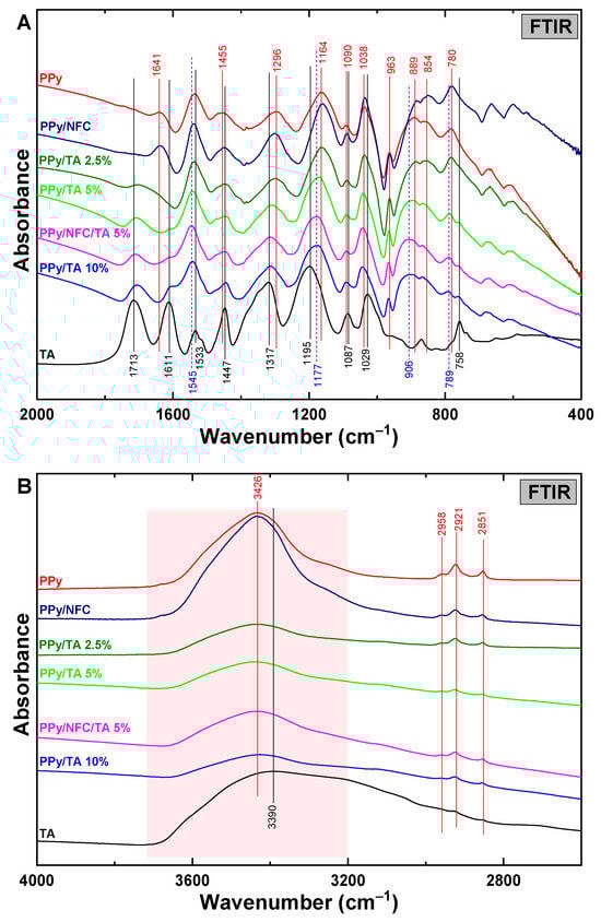 Infrared spectra of PPy, PPy/TA composites prepared with 2.5, 5.0, and 10 mole% of TA, PPy/NFC and PPy/NFC/TA 5% aerogels in the region of 450–2000 cm−1 (A) and 2600–3800 cm−1 (B).