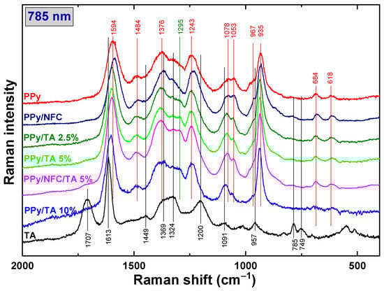 Raman spectra of PPy, PPy/TA aerogels prepared with 2.5, 5.0, and 10 mole% of TA, PPy/NFC and PPy/NFC/TA 5% aerogels.