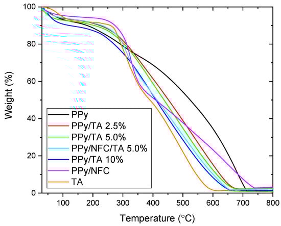The thermal gravimetric analysis of the various PPy aerogels shows that their thermal stability was slightly decreased by increasing TA content (Figure 4). Among the aerogels, PPy/NFC aerogel showed the highest thermal stability. For all the aerogels, the first gradual weight loss up to 110 °C is due to the loss of absorbed moisture. The second weight loss step at around 220 °C is assigned to the degradation of TA and cellulose macromolecules, and the complete loss of PPy dopant. The full decomposition of the aerogels took place around 680 °C in the case of PPy/TA 10%, 650 °C in the case of PPy/TA 2.5% or PPy/NFC/TA 5%, and 735 °C in the case of PPy/NFC aerogels. The neat TA and PPy powders fully decomposed at around 600 and 715 °C, respectively.