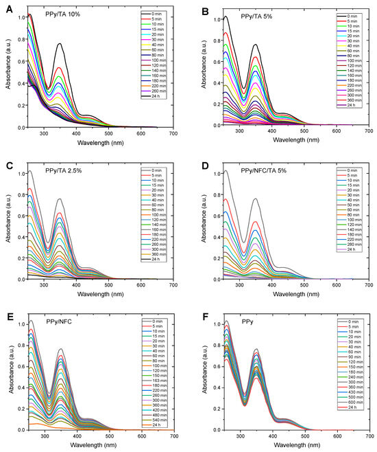UV-visible spectra of Cr(VI) over time while adsorbing onto PPy/TA with 10 (A), 5.0 (B), 2.5 (C) mole% of TA, PPy/NFC/TA 5% (D), PPy/NFC aerogels (E), and neat PPy powder (F).