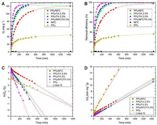 Time-dependent adsorption capacity (A) and removal efficiency (B) of Cr(VI) ions adsorbing onto PPy/TA with various mole% of TA, PPy/NFC, PPy/NFC/TA 5% aerogels, neat NFC and neat PPy powder. Pseudo-first-order (C), and pseudo-second-order (D) kinetic modeling.