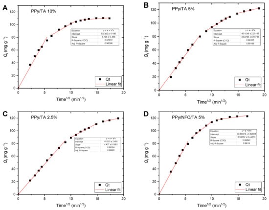Intraparticle diffusion modeling of Cr(VI) ions adsorption onto PPy/TA aerogels prepared with 10 (A), 5.0 (B), and 2.5 (C) mole% of TA, PPy/NFC/TA 5.0% (D), PPy/NFC (E), and neat PPy powder (F).