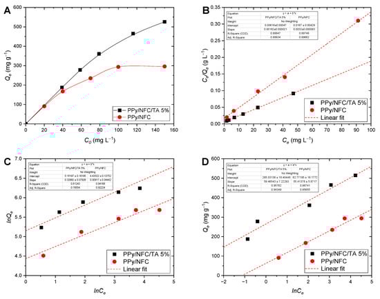 The equilibrium isotherms were determined for the selected adsorbents in a batch mode by mixing 0.005 g of the aerogels with varied concentrations of Cr(VI) solutions (25 mL) within the range 25–150 mg L−1, at pH 2, room temperature, and 200 rpm stirring. The equilibrium point was taken after 48 h. The experimental data were fitted against Langmuir (Equation (6)), Freundlich (Equation (7)), and Temkin (Equation (8)) isotherm models as follows: