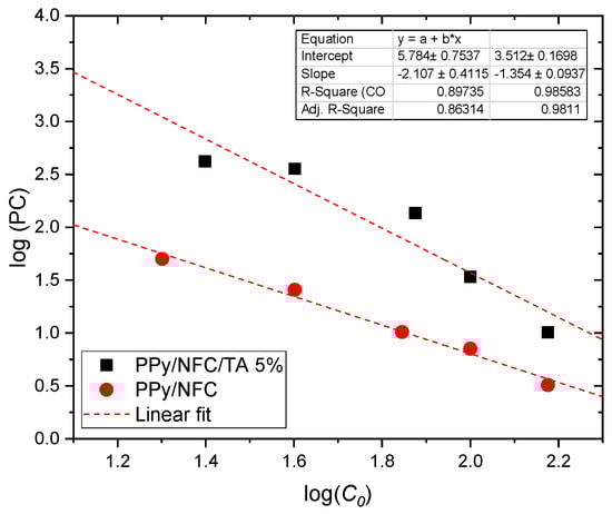 For a better understanding of the adsorption performances of PPy/NFC compared with PPy/NFC/TA 5% aerogels, their partition coefficient (PC; L g−1) was compared. Unlike the removal efficiency and adsorption capacity, PC does not depend on the operating conditions. PC indicates the real adsorption performance and helps to understand the affinity of a Cr(VI) for the aerogel compared with the aqueous phase. PC is the ratio of adsorbate concentration in the solid phase to the concentration in the liquid phase at equilibrium (Equation (9)) [43]. Figure 9 represents the calculated PC of PPy/NFC aerogel prepared in the absence and presence of TA as a function of initial Cr(VI) concentrations.