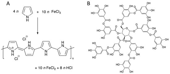 Oxidative polymerization of pyrrole with iron(III) chloride to PPy hydrochloride (A); the chemical structure of TA (B).