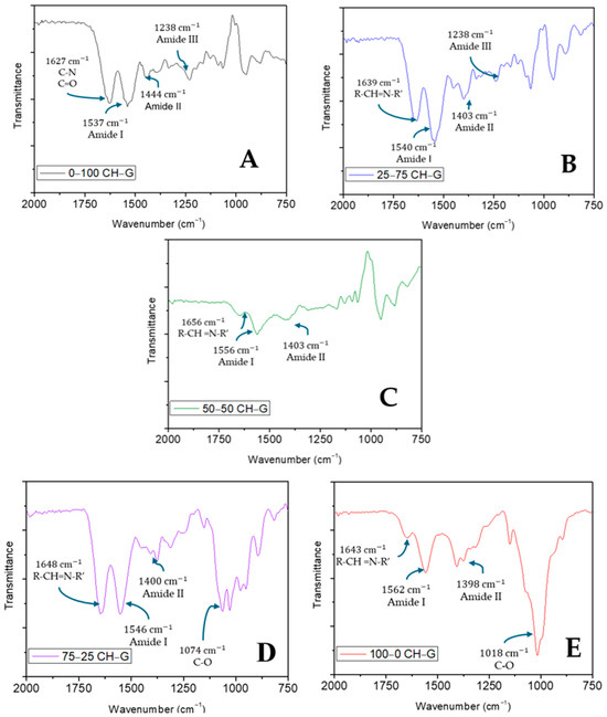 Fourier Transform Infrared Spectroscopy (FTIR) of the different hydrogels synthesized: (A) 0–100 CH–G; (B) 25–75 CH–G; (C) 50–50 CH–G; (D) 75–25 CH–G; (E) 100–0 CH–G.