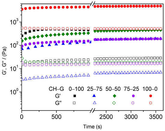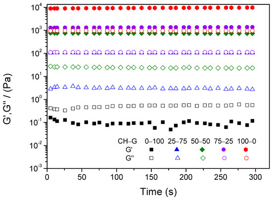 Time sweep test of chitosan–type-A-gelatin-based hydrogels at 40 °C.