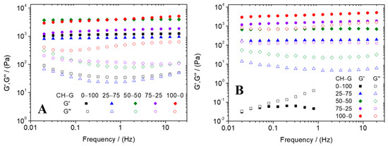 Frequency sweep test of chitosan–type-A-gelatin hydrogels evaluated at 5 °C (A) and 40 °C (B).