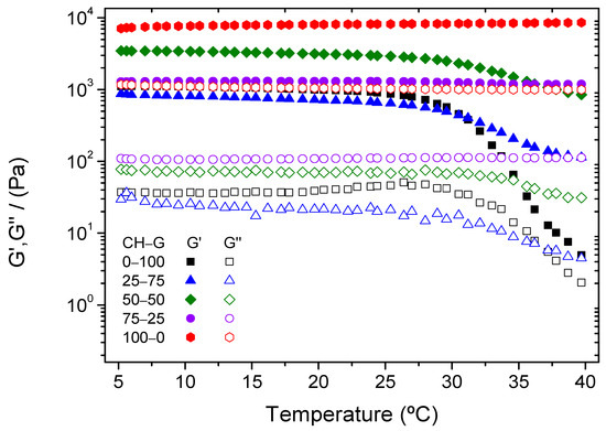 Subsequently, temperature ramps were evaluated, and the results are shown in Figure 4. Firstly, it can be noted that the chitosan-based hydrogels are thermal stable compared with hydrogels that were developed only with type A gelatin. To corroborate this information, the critical temperature of each system was obtained and included in Table 1. The value of the critical temperature also indicated that hydrogels with a higher proportion of chitosan or unitary chitosan hydrogel have greater thermal stability than hydrogels elaborated with a higher proportion of type A gelatin. It can also be attributed to gelatin melting above 30 °C [30].