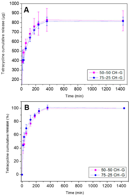 Evolution of the release kinetic of tetracycline-loaded hydrogels (50–50 CH–G and 75–25 CH–G) at 37 °C. (A) Amount of tetracycline released, (B) Percentage of tetracycline released.