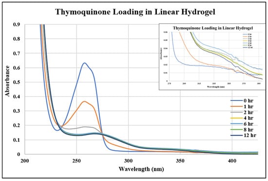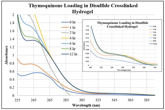 Figure 2 depicts the different behavior of thymoquinone drugs with disulfide-crosslinked gel. Thymoquinone was loaded in the linear gel gradually demonstrated by a higher initial peak of the remnant. The peaks decreased over time, meaning the drugs were absorbed in the gel system, thus leaving less concentration in the remnant. The initial peak is found at a lower value for thymoquinone loading in the disulfide-crosslinked system at zero hours, occurring at 248 nm wavelength, and the peak is found to increase at 1 h to 240 nm wavelength. This indicates the drug was loaded in the gel rapidly at zero hours and returned to the solution when submersed for a longer time; therefore, the peak at 1 h is higher than the initial peak. Interestingly, due to the interactions of the drug, hydrogel, and solvent, higher values of absorbance are observed at this wavelength for longer times, but these peaks are ignored for the analysis in this study. However, the second peak, found at 355 nm for this drug, shifted to the right with a higher wavelength and lower absorption, as shown in the inset of