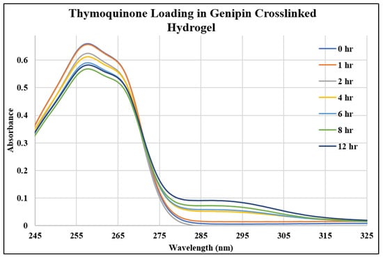 Figure 2. This can be used for the release analysis of lower concentrations. However, to be consistent in the comparison with different drugs and gels, the first two peaks found at 248 nm are used for the analysis of loading in this disulfide-crosslinked system. The initial loading of thymoquinone in the genipin-crosslinked system shows a higher initial peak of the remnant at 258 nm wavelength, which decreases gradually over time, meaning the drug loading is steady and the concentration accumulates over time for this system, as shown in