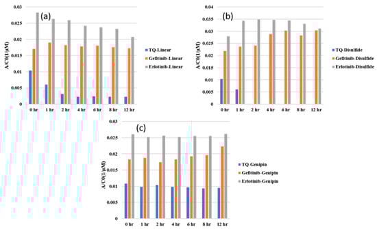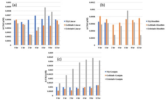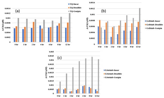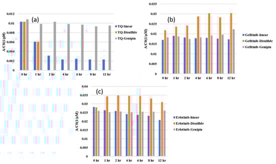 Figure 7a shows the loading data of thymoquinone in three different types of gel, and indicates that thymoquinone loading in linear chitosan happens over the whole period, and is stable for genipin for the whole time. Gefitinib and erlotinib are both less favorable in disulfide-crosslinked systems, as depicted in