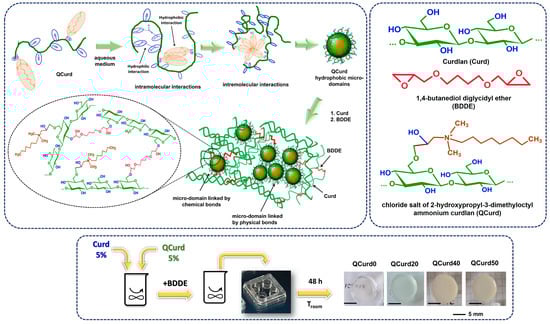 The new hydrogels based on QCurd/Curd were successfully obtained by covalent cross-linking of a mixture of Curd and QCurd with octyl groups using 1,4-butanediol diglycidyl ether (BDDGE) as crosslinker under alkaline conditions. The notation of the hydrogel samples was QCurdX, where X represents the mass percent (%) of QCurd from the QCurd/Curd mixture (Table 1). Figure 1 illustrates the chemical structure of the hydrogel components and provides a schematic representation of the arrangement of the polysaccharide chains in its chemical structure. As can be seen from Figure 1, the covalent cross-linking of curdlan resulted in white and transparent hydrogels. (QCurd0), while the presence of QCurd, even in small amounts, led to opaque hydrogels (QCurd20). This aspect could be attributed to the hydrophobic domains within the QCurd structure, which form the “hydrophobic micro-domains” during the dissolution process due to the concentration of the working solution (CQCurd = 5 g/dL), which was above the entanglement concentration (the limit between semi-dilute unentangled and semi-dilute entangled ranges) established to be Ce = 1.14 g/dL for this curdlan derivative [17]. Some of these hydrophobic micro-domains were covalently linked through BDDE in the hydrogel structure, while others remained linked by physical interactions such as hydrogen bonds or hydrophobic forces (Figure 1). Table 1 lists the composition and the main characteristics of the prepared hydrogels.