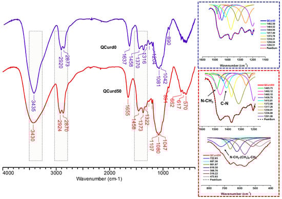 FTIR spectra of hydrogels without QCurd (QCurd0) and with quaternary derivative (QCurd50) are shown in Figure 2. The spectra of QCurd0 and QCurd50 show the characteristic bands for the parent polymers (Figure S2 from the Supplementary Materials) and a change in the intensity of some bands due to the chemical bonds with BDDE. Thus, the large band at 3435 cm−1 (QCurd0) and 3430 cm−1 (QCurd50) was attributed to O–H bond stretching vibration, and to the intra- and inter-molecular hydrogen bonds, while the bands from 2920–2924 cm−1 and 2873–2870 cm−1 were attributed to symmetric and asymmetric stretching vibrations of C–H bonds from CH2, CH groups, and CH2–O from ether linkages of QCurd50. The increase in the intensity of the band at 2870 cm−1 (QCurd50) was associated with CH3/CH2 groups from quaternary ammonium pendant groups (CH3-N, –CH2–N). In addition, the widening of the band from 2924 to 2870 cm−1 in the case of hydrogels compared with the parent polysaccharides (Figure S2) was associated with the increase in the number of CH2/CH groups due to the cross-linker agent (BDDE). The band at 1655 cm−1 was associated with bound water in the polysaccharide structure; this region can shift depending on the intensity of the interaction of the polymer with water.