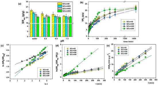 (a) Swelling ratio at equilibrium of QCurd/Curd hydrogels in deionised water and various PBS solutions; (b) swelling kinetics performed in PBS 5.5 and 32 °C; (c) plots of ln(SRt/SReq) vs. ln(t), (d) first-order model, and (e) second-order model, in PBS 5.5 and 32 °C.