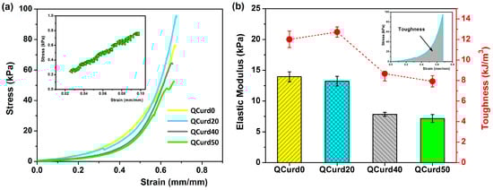 (a) Stress–strain profiles of QCurd/Curd hydrogels hydrated in PBS (pH = 5.5); inset figure shows the linear part of the compression curve used to obtain the elastic modulus for QCurd50 sample; (b) elastic modulus and toughness values of QCurd/Curd hydrogels.