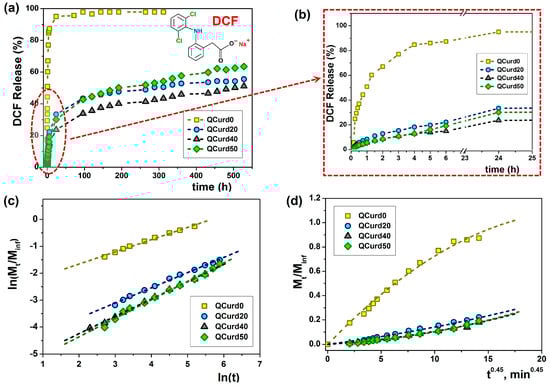 Release dynamics of DCF from loaded QCurd/Curd hydrogels in PBS (pH 5.5) at 32 °C (a); detail of the dynamic DCF release and (b); plot of Ritger-Peppas (c) and Peppas-Sahlin (d) models.